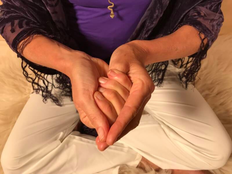 A meditative movement with Shankh Mudra. Gather your energy and connect with inner knowing from your belly. The rocking motion balances the left and right hemispheres of the brain and calms your nervous system. Use the affirmation "I listen to my inner voice. I experience the value of quieting down." The "Om" mantra combined with Shankh Mudra and this movement helps to connect with your inner wisdom and intuition. It is a loving reminder to trust yourself and the paths you choose to follow.