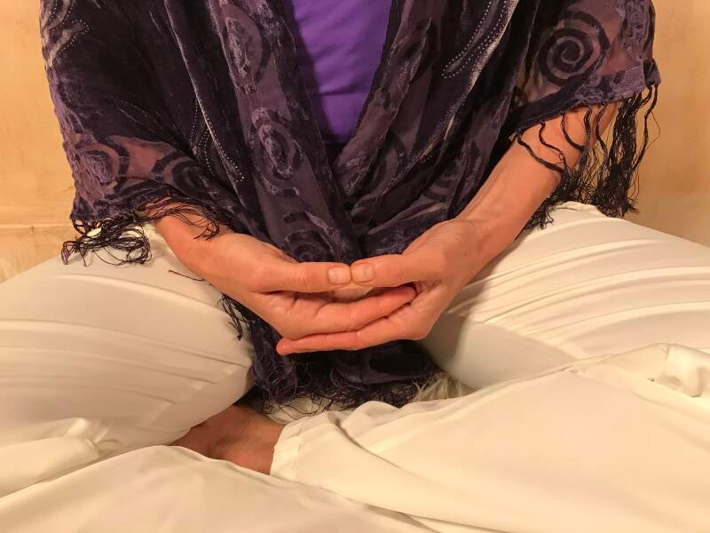 - Een mudra van rust en kalmte waarbij de handen rusten in je schoot met de duimen tegen elkaar.