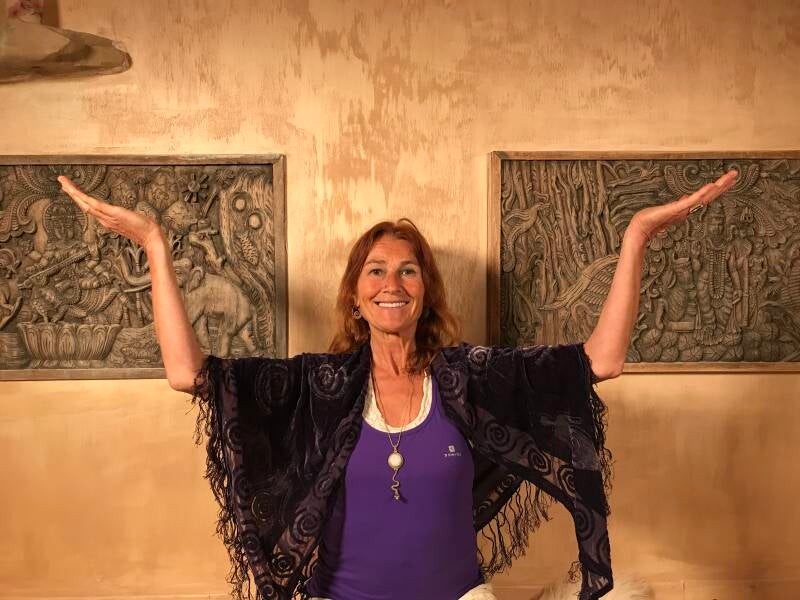 Formation du Mudra : Vos bras sont ouverts, avec les paumes tournées vers le haut, vos coudes au niveau de vos épaules. Cette posture symbolise la joie et l'ouverture pour recevoir la béatitude.